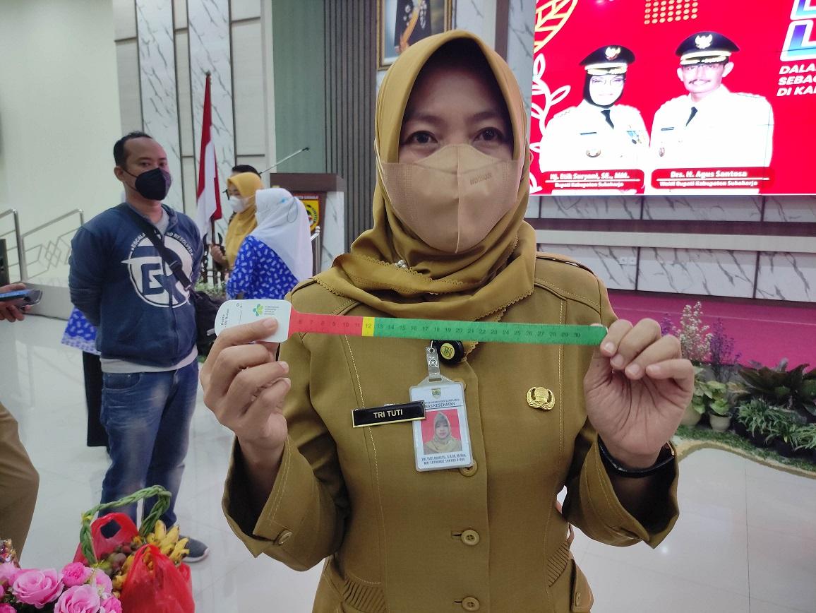 Kepala Dinas Kesehatan Sukoharjo Tri Tuti Rahayu mengenalkan pita LiLA alat ukur lengan anak untuk deteksi status gizi.