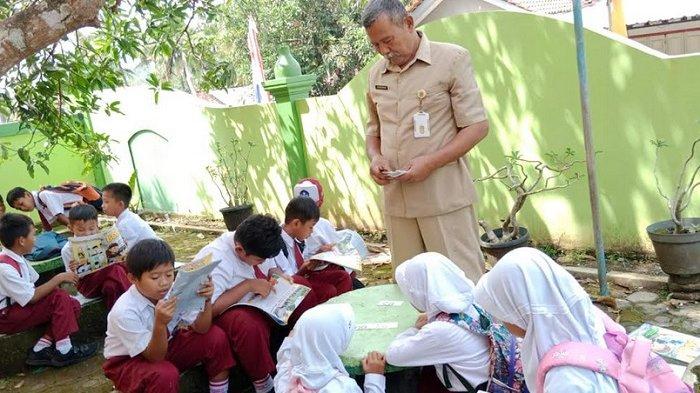 TRIBUNJATENG.COM, BANYUMAS -- Siswa-siswi SDN 2 Ciarus, Desa Randegan, Kecamatan Wangon, Kabupaten Banyumas terpaksa belajar di emperan halaman sekolah.