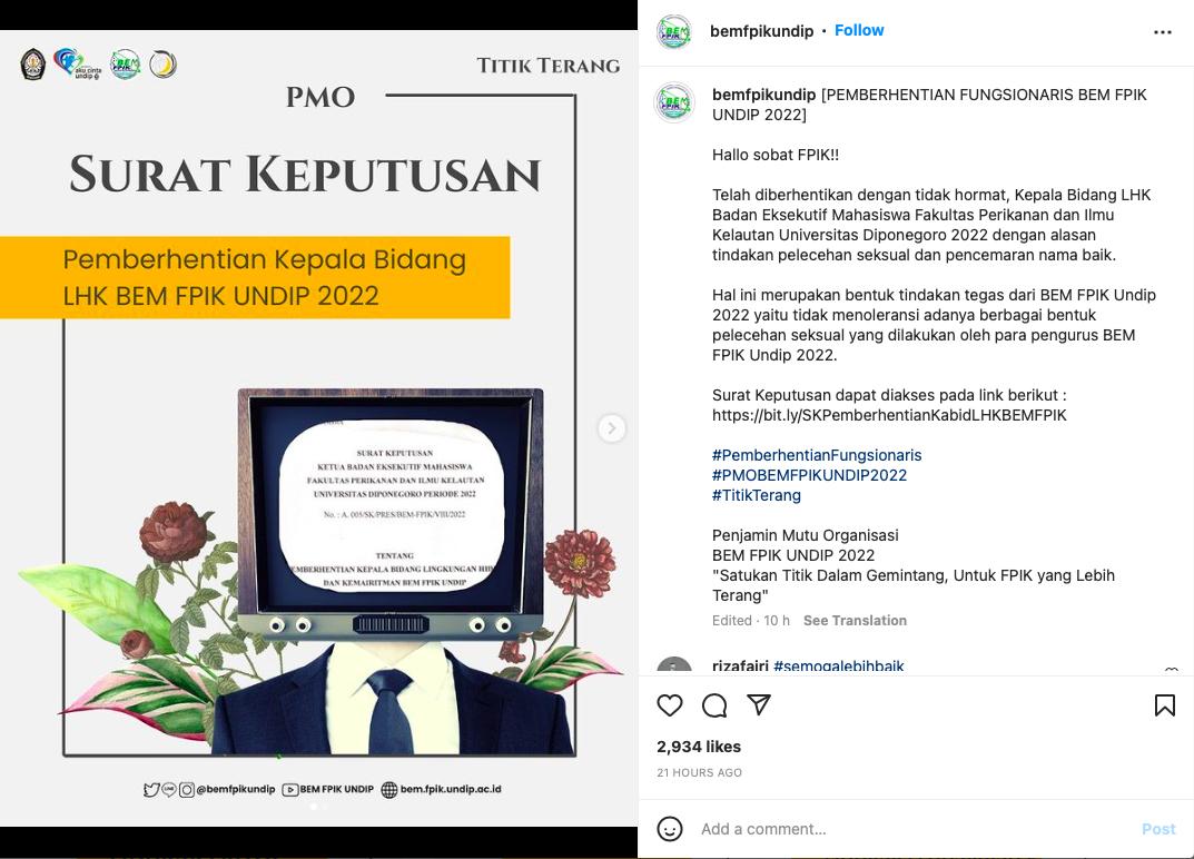 Pengumuman itu juga dipublikasi dalam akun Instagram @bemfpikundip baik melalui postingan maupun cerita Instagram.