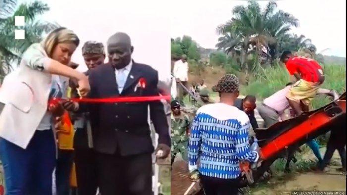 Para pejabat tersungkur tepat setelah mereka memotong pita peresmian jembatan penyeberangan di ibu kota Republik Demokratik Kongo (RD Kongo).