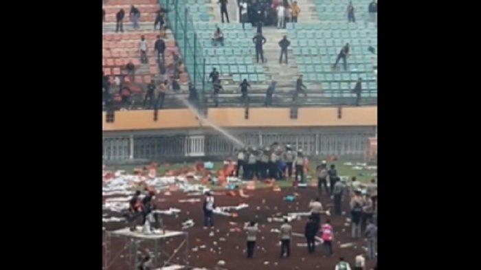 Para supporter yang kecewa terus meronta, dan di lapangan terpantau ada kemunculan api.