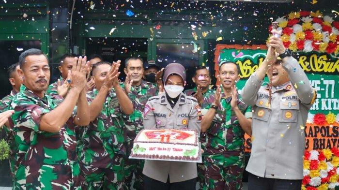 Rombongan Polres Tegal tidak hanya berkunjung, tapi juga membawa tumpeng dan kue ulang tahun sebagai simbol bentuk sinergitas TNI-Polri yang sudah terjalin kuat.