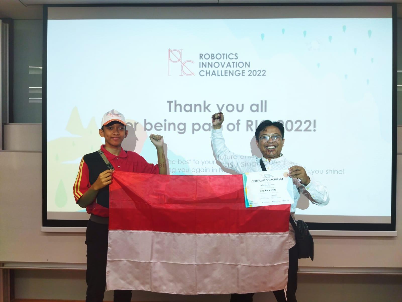 TRIBUNMURIA.COM, PATI – Siswa MTsN 1 Pati, Hafiz Ulumuddin Karim, mengibarkan Bendera Merah Putih dalam ajang Robotics Innovation Challenge (RIC) 2022 di Singapura.