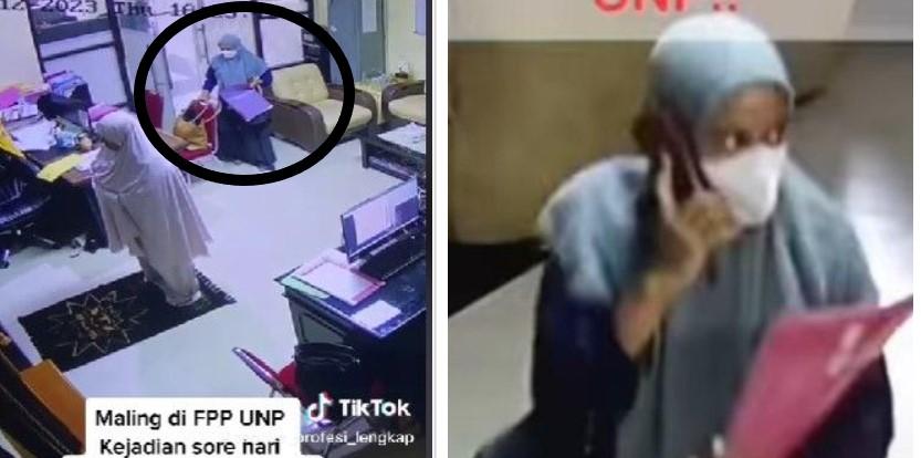 Seorang wanita berhijab mencuri tas berisi laptop dan uang Rp 20 juta di Fakultas Pariwisata dan Perhotelan (FKPP) Universitas Negeri Padang (UNP).