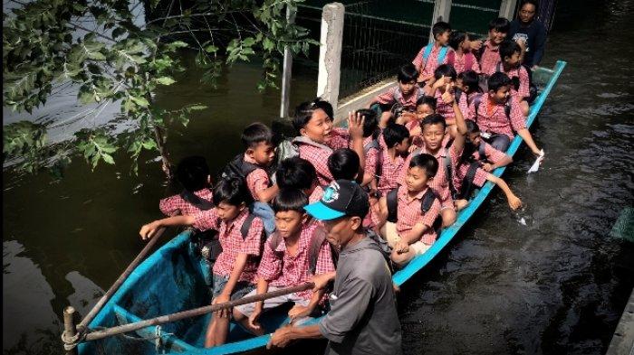 Dengan celana pendek ala kadarnya dan sandal rumahan, siswa Kelas 3 hingga 6 menaiki perahu pada pukul 06.00WIB untuk melintasi banjir sekira 80-an sentimeter menuju sekolahnya.