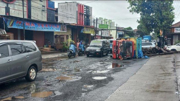 Truk berplat nomor R 8650 BT itu terguling usai terperosok lubang jalan. Akibatnya, lalu lintas di area tersebut kini tersendat. Saat ini truk bermuatan kayu itu masih proses evakuasi.