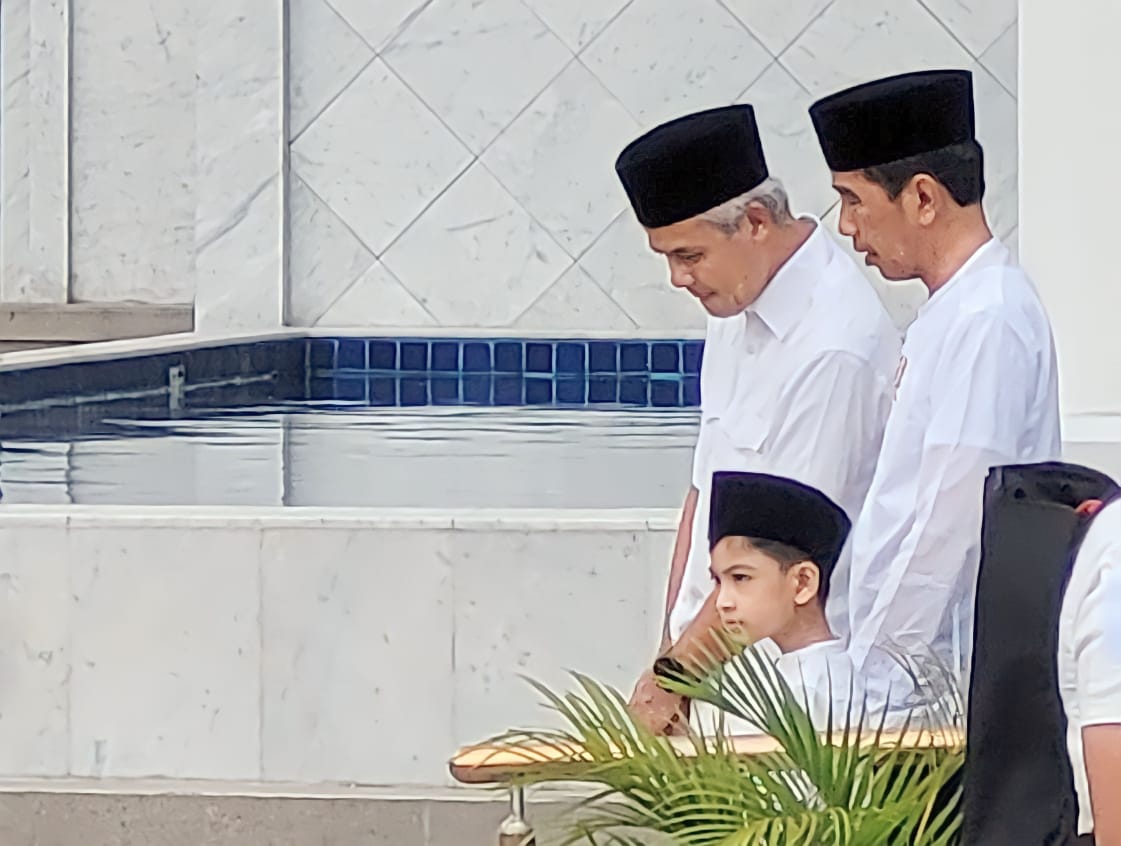 Jokowi dan Ganjar kompak mengenakan baju putih dan berpeci hitam, keduanya tampak duduk berdekatan. Di tengah mereka, ada cucu Jokowi, Jan Ethes.