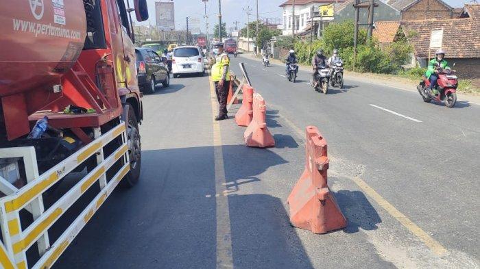 TRIBUNJATENG.COM, DEMAK - Satlantas Polres Demak melaksanakan rekayasa lalu lintas dengan mengatur arus lalin di lokasi peninggian jalan Pantura Sayung, Demak, Minggu (4/6/2023).
