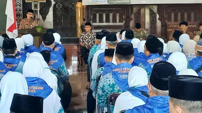 TRIBUNJATENG.COM, KUDUS - Bupati Kudus HM Hartopo melepas keberangkatan jemaah calon haji kelompok terbang (kloter) 87 di Pendopo Kabupaten Kudus, Senin (19/6/2023).