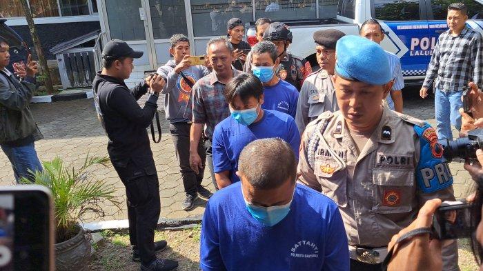 Polisi menunjukkan tiga dari empat tersangka kasus aktivitas penambangan emas ilegal di Kawasan Tambang Rakyat, Desa Pancurendang, Kecamatan Ajibarang, Kabupaten Banyumas, di Mapolresta Banyumas, Jumat (28/7/2023).