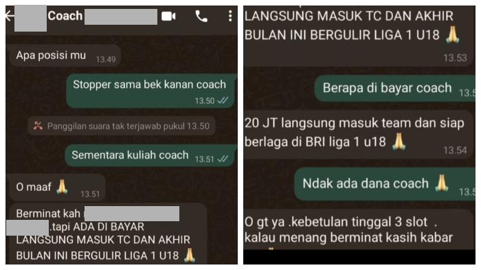 Di media sosial tersebar tangkapan layar hasil percakapan antara calon pemain sepak bola dan oknum pelatih.