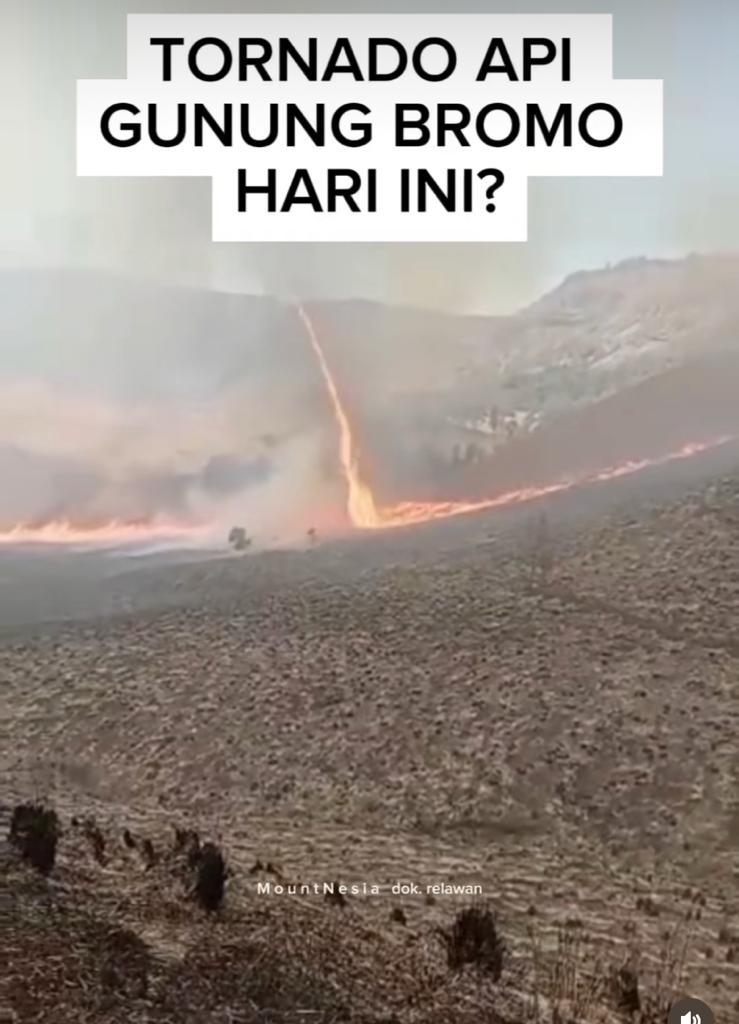 "Dikabarkan tornado api muncul di kebakaran Gunung Bromo pada hari ini 10 September 2023. Kebakaran akibat Prewed Flare Gunung Bromo masih berlangsung dan susah dipadamkan." tulis pengunggah.
