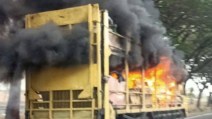 Diduga akibat korsleting baterai sepeda listrik, satu truk pengangkut sepada listrik terbakar api.