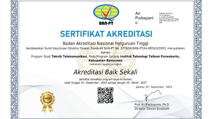 TRIBUNJATENG.COM - Program Studi Sarjana Teknik Telekomunikasi Institut Teknologi Telkom Purwokerto berhasil mempertahankan predikat akreditasi “Baik Sekali” berdasarkan surat keputusan direktur dewan eksekutif badan akreditasi nasional perguruan tinggi nomor 379/SK/BAN-PT/Ak.KP/S/IX/20223.