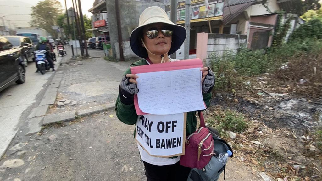 Wanita Jalan Kaki dari Bawen ke Kantor Gubernur Jateng Bawa Tulisan PRAY OFF EXIT TOL BAWEN