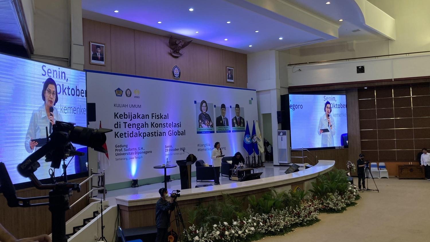 Menteri Keuangan Sri Mulyani menyampaikan Kuliah Umum Kebijakan 'Fiskal di Tengah Konstelasi Ketidakpastian Global' di Undip Semarang.