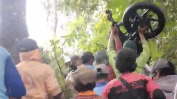 Belasan warga mengevakuasi motor tersebut dengan digotong untuk keluar dari jurang.