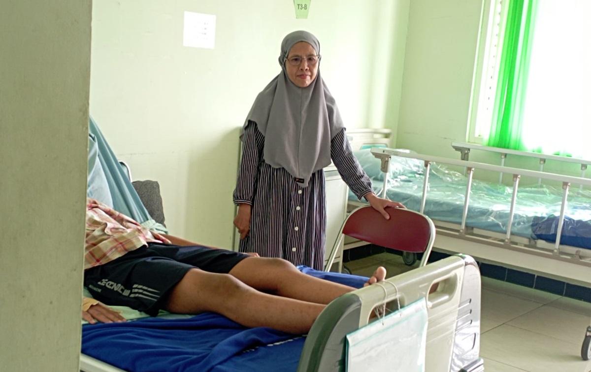 Warsiyatun, warga Desa Sukoharjo, Kecamatan Margorejo, Pati, menunggui anak lelakinya yang berusia 14 tahun di RSUD Soewondo.