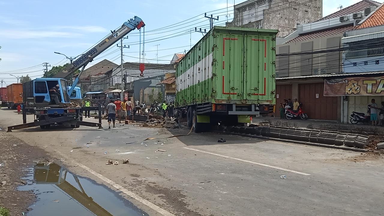 Truk kontainer bermuatan gula bernomor polisi T 9713 TC mengalami kecelakaan tunggal di jalan Pantura Wiradesa