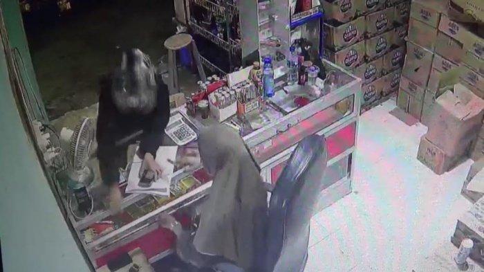 Pemuda di dalam toko awalnya terlihat membeli chip Higgs Domino. Namun, setelah beberapa waktu, dengan cepat, ia mengambil handphone milik pemilik toko dan paket data dari dalam etalase.