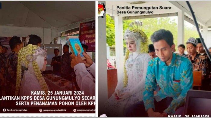 Potret pengantin wanita menghadiri pelantikan KPPS masih mengenakan kebaya pengantin itu viral setelah diunggah akun Facebook Pps Goenoengmulyo pada Kamis (25/1/2024).