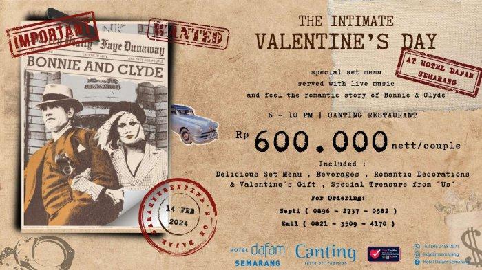 Selain itu, Hotel Dafam Semarang juga menawarkan promo dinner Valentine dengan tema "THE INTIMATE VALENTINE'S DAY Bonnie And Clyde." Dengan harga Rp.600.000 per pasangan, tamu akan mendapatkan set menu lezat, minuman, dekorasi romantis, hadiah khusus dari hotel, dan pertunjukan khusus oleh SMARADANA. Ini adalah kesempatan sempurna untuk merayakan cinta bersama orang yang dicintai dan menghargai kehidupan yang diberikan kepada kita.