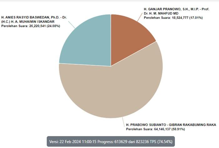 Hingga Kamis, 22 Februari 2024 pukul 11:00 WIB dari progress 613629 dari 823236 TPS atau sekitar 74.54 persen suara masuk.