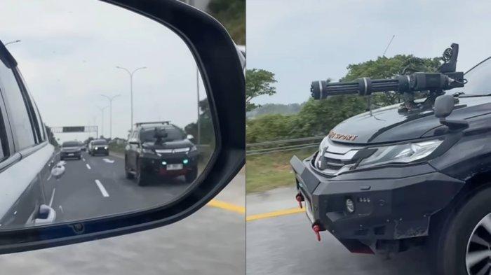 Mobil dipasangi benda menyerupai senapan mesin pada kapnya melaju di jalan tol, viral di media sosial.
