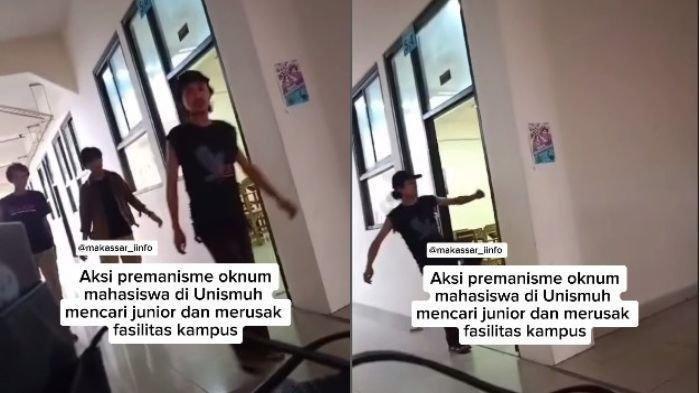 "Aksi premanisme oknum mahasiswa di Unismuh mencari junior dan merusak fasilitas kampus," tertulis dalam video.