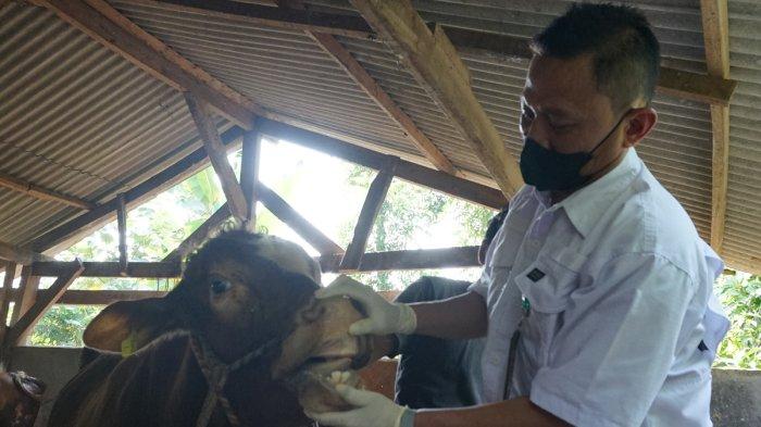 Petugas kesehatan hewan dan dokter hewan mengecek satu persatu kondisi sapi dengan melihat tubuh dan mulut sapi.