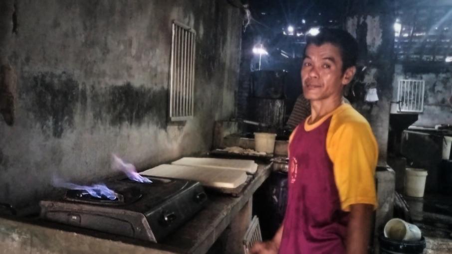 Usai mengobrol dengan Suripno, Subandi yang mengenakan kaos berwarna biru, terlihat sedang memotong tahu diatas papan datang menghampiri.
