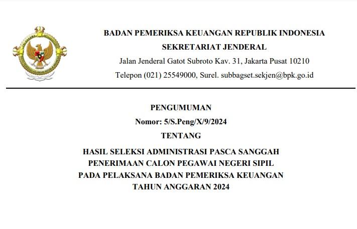 Berdasarkan Pengumuman Nomor 02/S.Peng/X/08/2024 tentang Revisi Persyaratan Penerimaan CPNS pada Pelaksana Badan Pemeriksa Keuangan Tahun 2024 dan Pengumuman Nomor 03/S.Peng/X/09/2024 tentang Perpanjangan Masa Pendaftaran Dan Pembubuhan Meterai Dalam Seleksi Pengadaan CPNS Pada Pelaksana Badan Pemeriksa Keuangan Tahun Anggaran 2024 telah dilaksanakan pendaftaran CPNS BPK Tahun 2024 dari tanggal 20 Agustus s.d 10 September 2024. Panitia telah melaksanakan seleksi administrasi atas data dan dokumen yang disampaikan oleh pelamar melalui laman https://sscasn.bkn.go.id/, dan berdasarkan seleksi administrasi tersebut disampaikan hal-hal sebagai berikut: