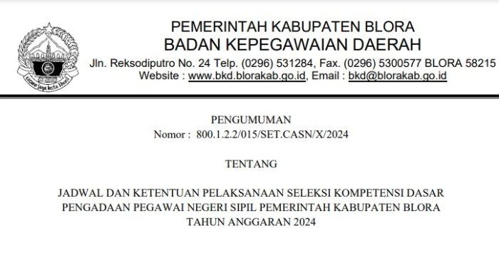 Pemkab Blora telah mengumumkan jadwal dan lokasi SKD CPNS 2024 bagi pelamar yang mendaftar di Pemkab Blora.