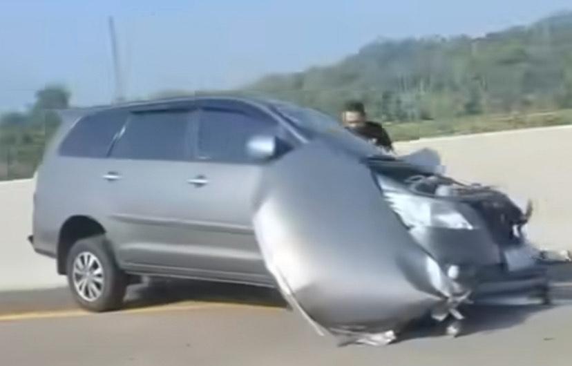 Dalam video yang beredar di media sosial, tampak bagian depan mobil Innova ringsek parah, dengan kap mesin nyaris terlepas akibat benturan keras.