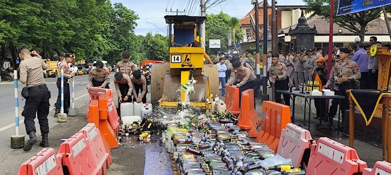Pemusnahan miras dilakukan dengan cara dilindas menggunakan alat berat yang telah disiapkan, sebagai simbol tindakan tegas terhadap peredaran barang haram tersebut.