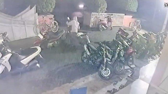 Berdasarkan rekaman CCTV, pelaku memulai aksinya dengan mendorong satu unit sepeda motor keluar ke pinggir jalan.