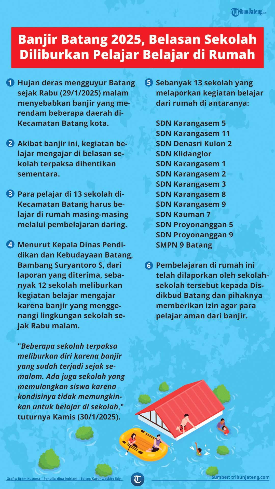 TRIBUNJATENG,COM - Infografis Banjir Batang 2025, Belasan Sekolah Diliburkan Pelajar Belajar di Rumah.