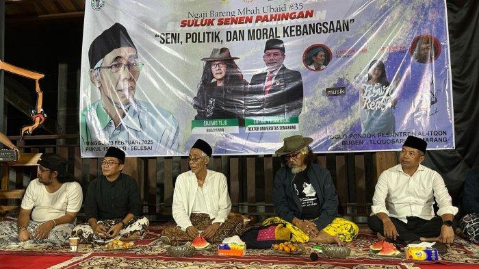 TRIBUNJATENG.COM - Suluk Senen Pahingan yang diasuh KH Ubaidillah Shodaqoh menghadirkan Rektor Universitas Semarang (USM) Dr Supari ST MT sebagai narasumber dengan tema “Seni, Politik, dan Moral Kebangsaan” di Joglo Pondok Pesantren Al Itqon Bugen Tlogosari Semarang pada Sabtu malam, 23 Februari 2025.