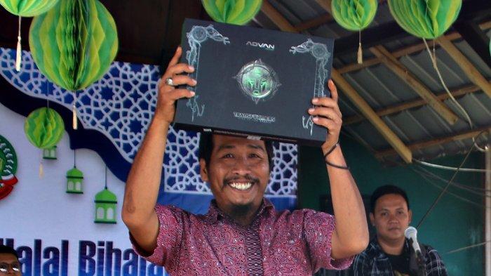 Luluk Purnomo, penjaga SDN 5 Bleboh Kecamatan Jiken, Kabupaten Blora, mendapatkan hadiah laptop pada halalbihalal Dinkominfo Blora
