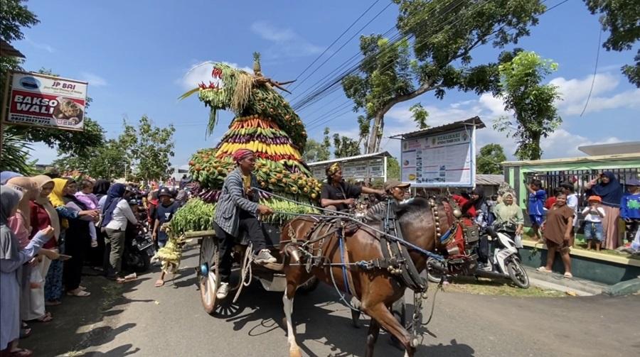 Prosesi sedekah bumi disemarakkan kirab budaya yang melibatkan partisipasi enam dukuh di desa tersebut.