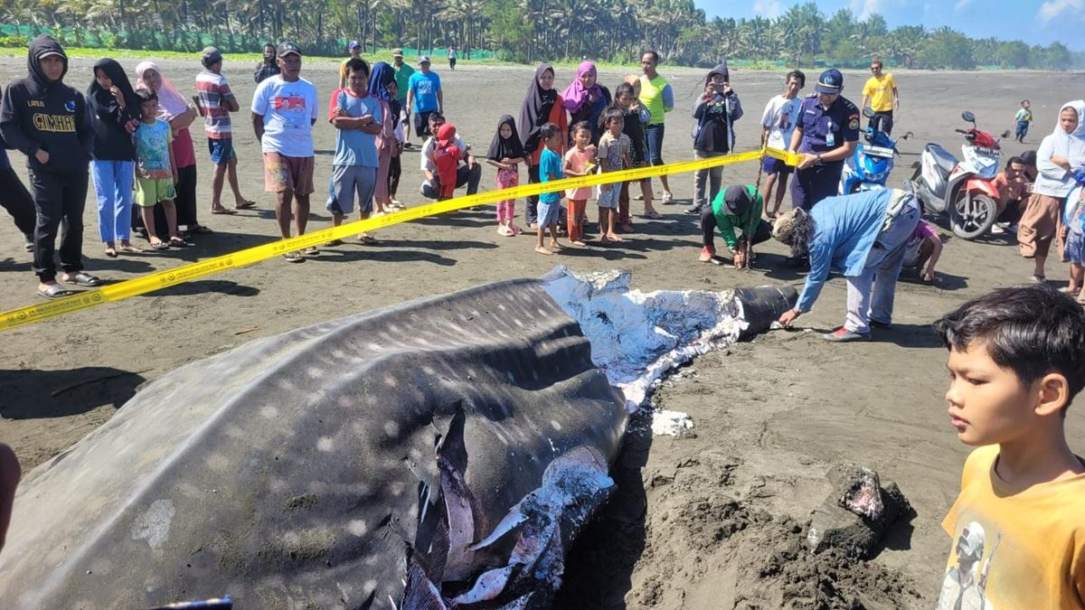 TRIBUNJATENG.COM, CILACAP - Seekor hiu tutul (Rhincodon typus) sepanjang sekitar 7 meter diperkirakan berbobot 3 ton ditemukan mati terdampar di Pantai Desa Welahan Wetan, Kecamatan Adipala, Kabupaten Banyumas, Kamis (26/6/2025).
