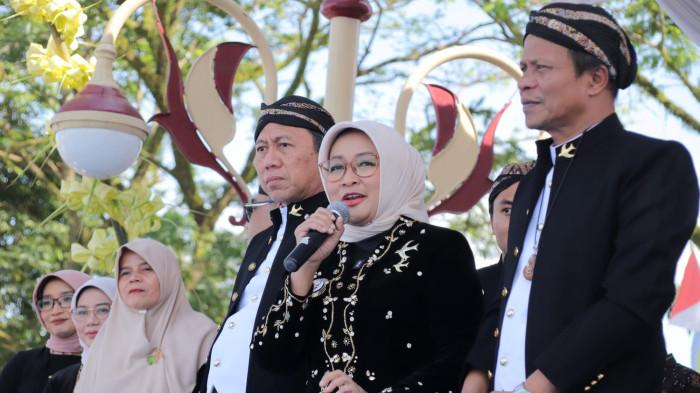 "Sekarang kita makan nasi penggel bersama, ya," ajak Bupati Lilis kepada ratusan penari.