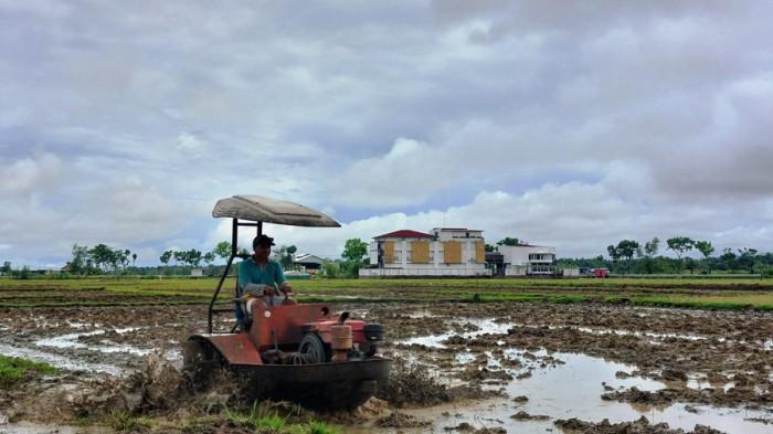 Petani Muda asal Desa Grenggeng, Setiadi (23) terpantau mengolah tanah dengan traktor perahu untuk persiapan masa tanam pertama pada Senin (27/10/2025) siang.