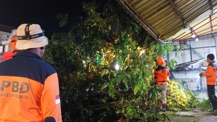BREAKING NEWS - Dampak Hujan Deras, Pohon Tumbang Timpa Kios di Alun-alun Kudus
