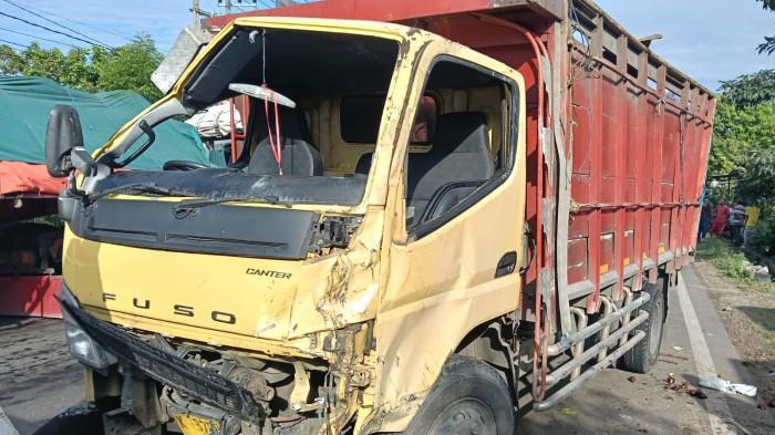 Truk mengalami kerusakan parah di bagian depan, sedangkan sepeda motor yang dikendarai korban juga ringsek dan rusak berat.
