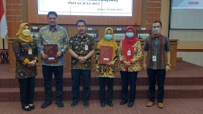 Sekda Kabupaten Jepara Edy Sujatmiko menyerahkan secara simbolis 48 SK pensiun PNS di Gedung Shima Pemkab Jepara, Jumat (1/7/2022).