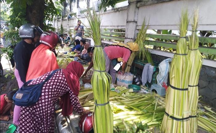 Puluhan penjual janur dan selongsong ketupat di depan Pasar Bitingan, Kabupaten Kudus mulai dibanjiri pembeli.