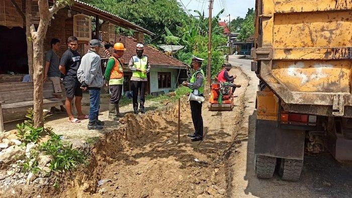 Satlantas Polres Pati memantau pekerjaan proyek di Jalan Raya Pati-Grobogan Kilometer 30, Selasa (7/6/2022).