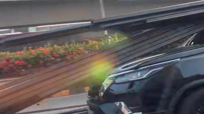 Mobil berwarna hitam berjenis Toyota Fortuner rusak dan mengalami ringsek di bagian atas pasca tertimpa besi dari muatan truk