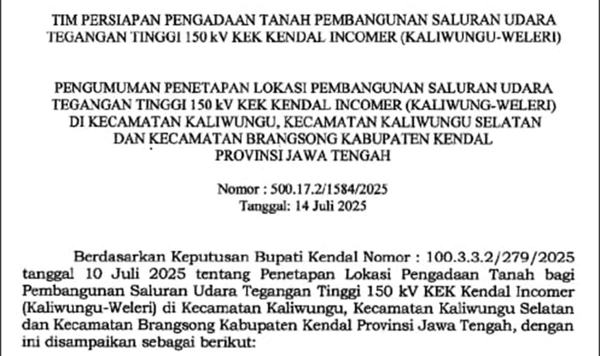 PENGUMUMAN Pengadaan Tanah Pembangunan SUTT 150 kV KEK Kendal Incomer Kaliwungu-Weleri